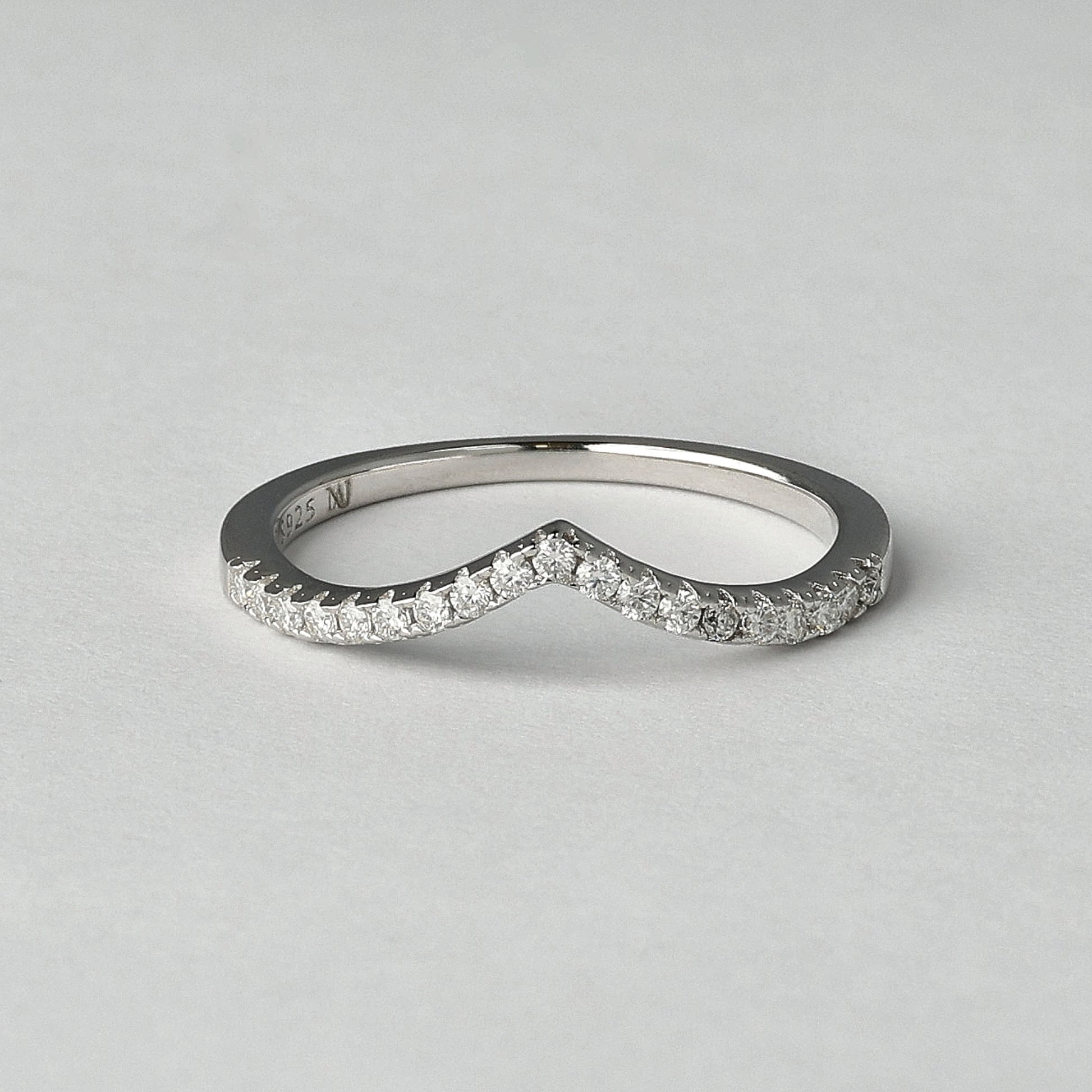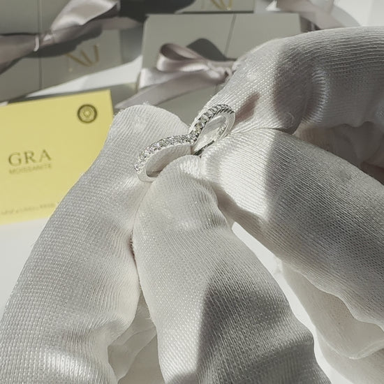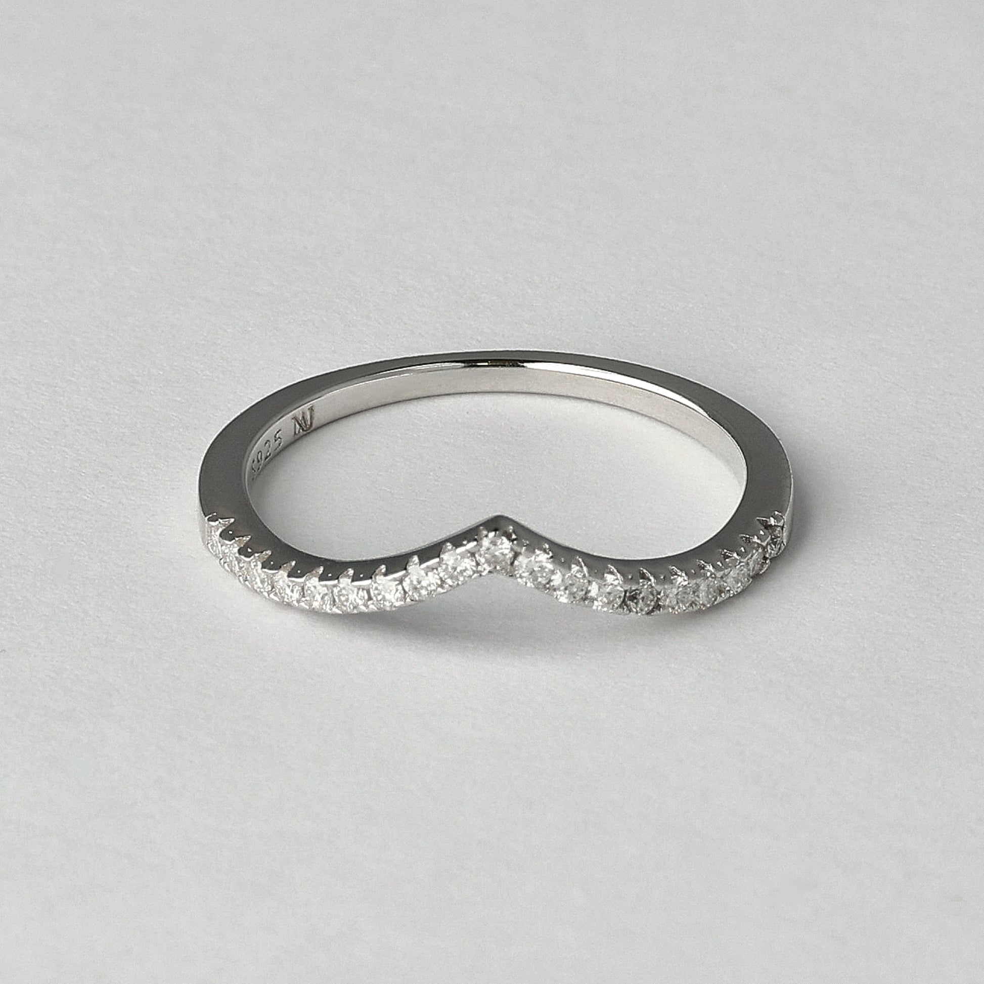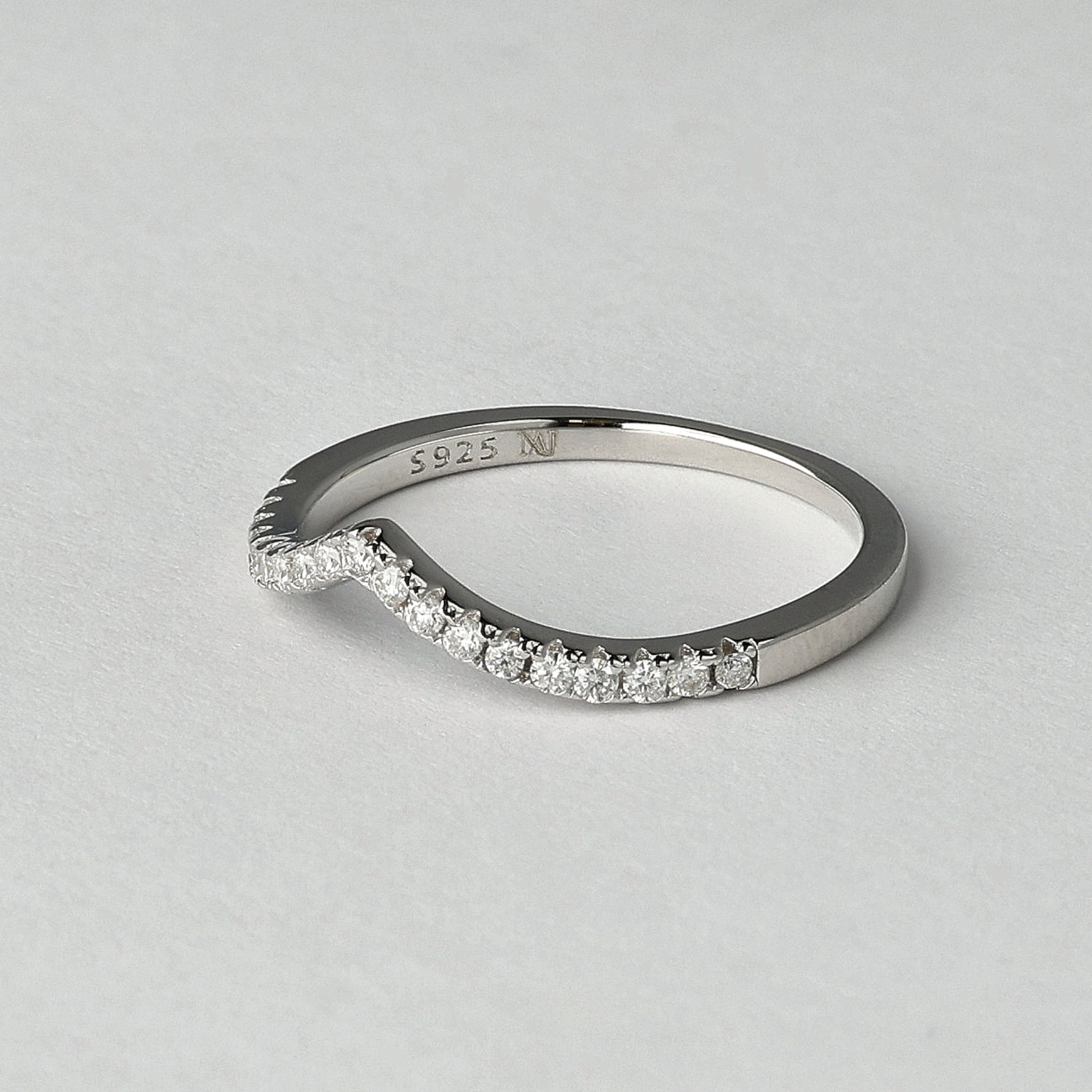 Ocean Wave žiedas atkartoja natūralią piršto liniją subtilia V formos silueto kreive, įkvėpta kylančios bangos ritmo. Smulkūs D spalvos moisanitai suteikia šviesos be sunkumo ir aiškumo be aštrumo. Dėvimas vienas jis išlieka minimalistinis ir lengvas, derinamas su kitais žiedais - sukuria išraiškingesnę kompoziciją. Pagamintas iš 925 prabos sidabro, dengto rodžiu, šis žiedas pasižymi švariu paviršiumi ir ilgai išliekančiu spindesiu.