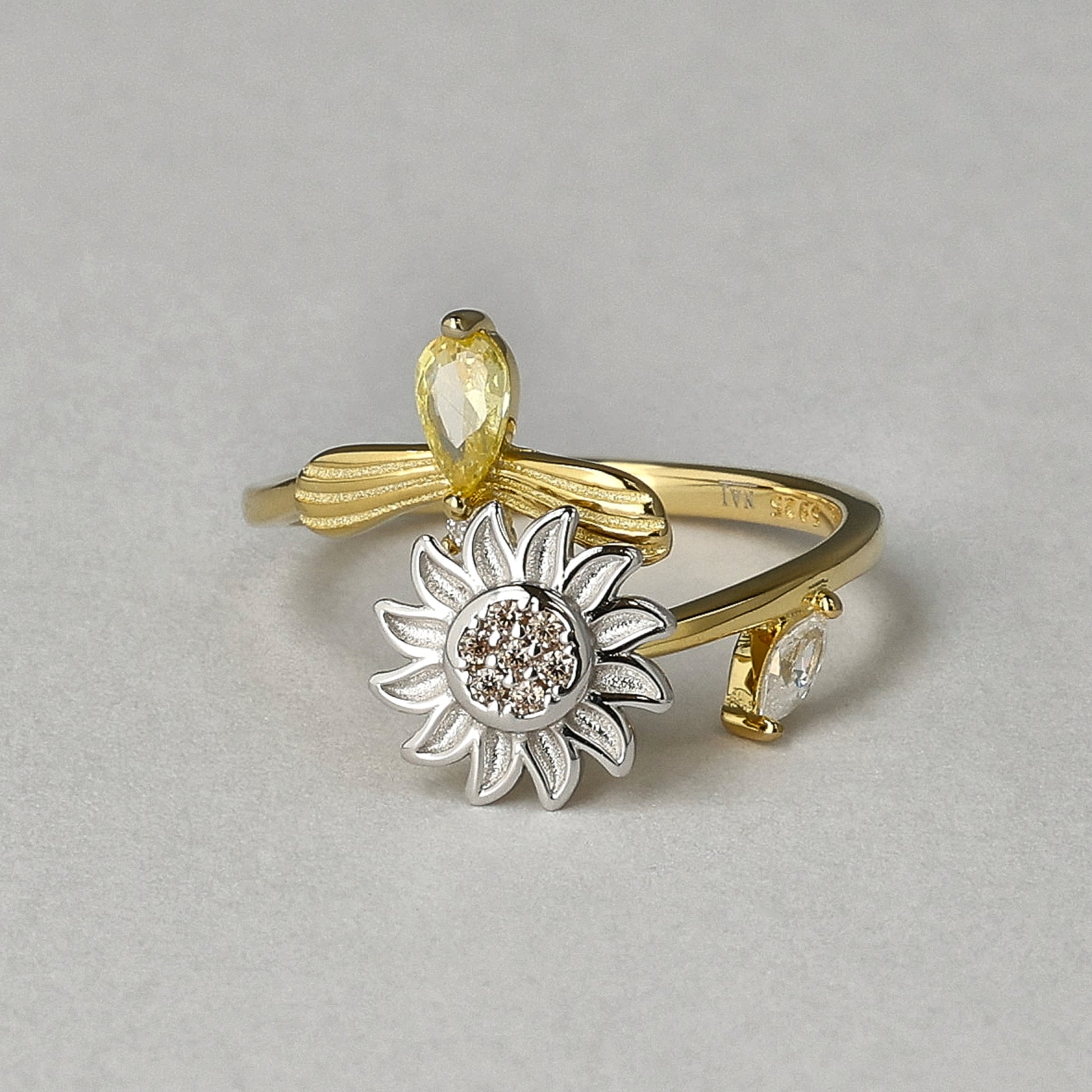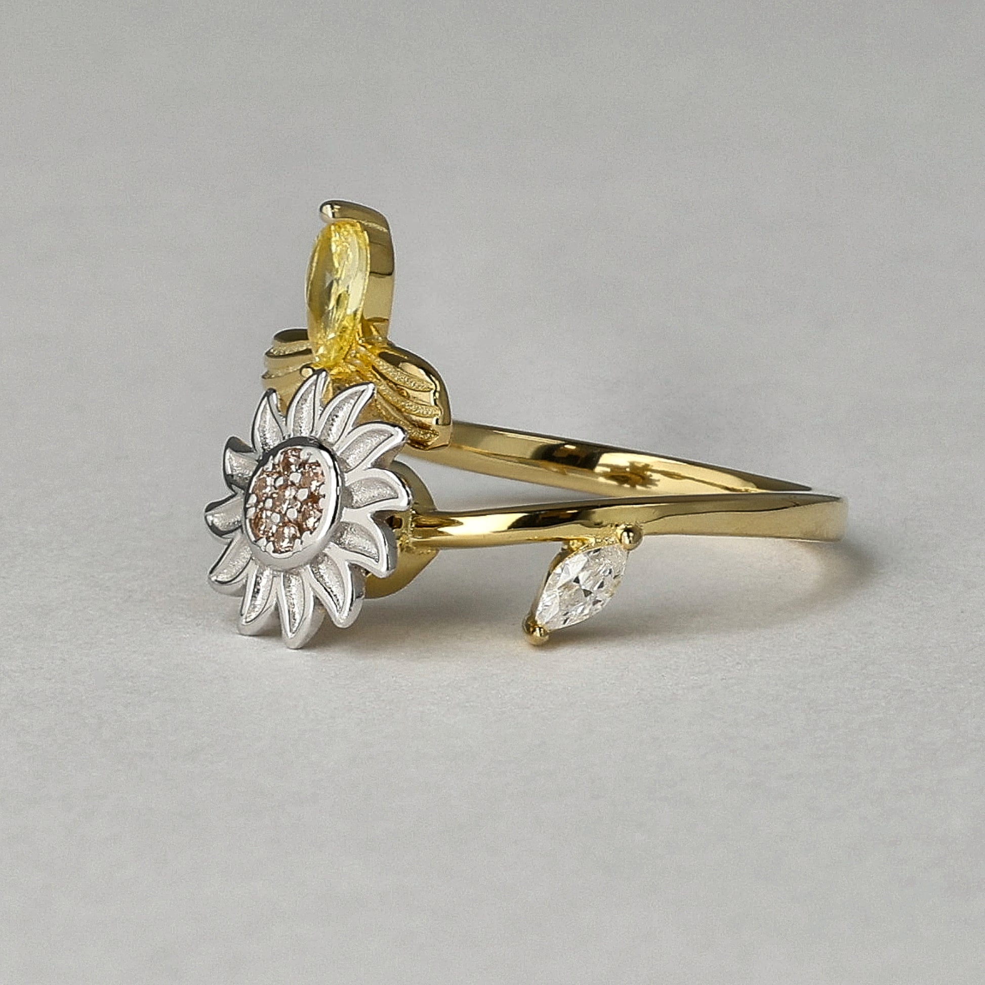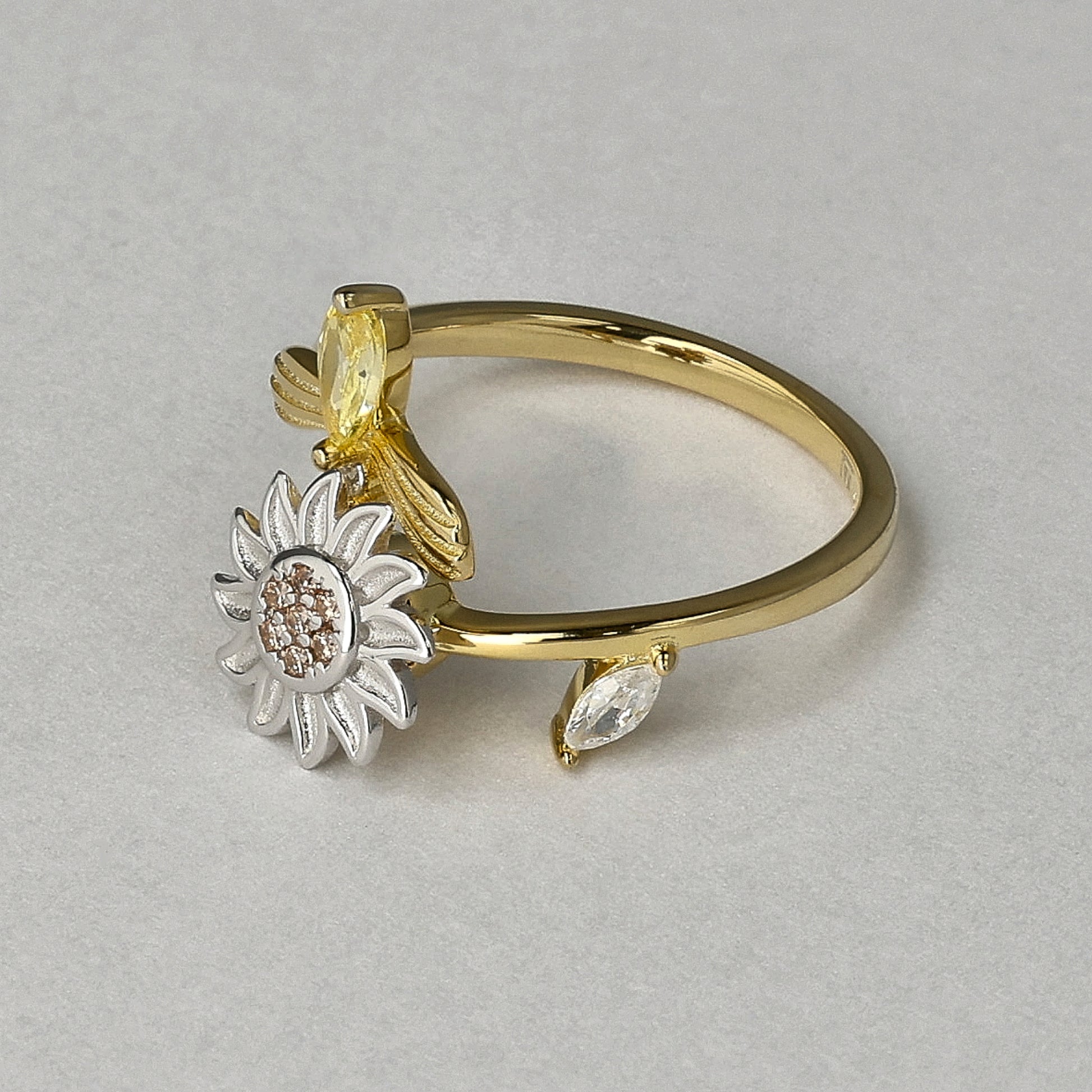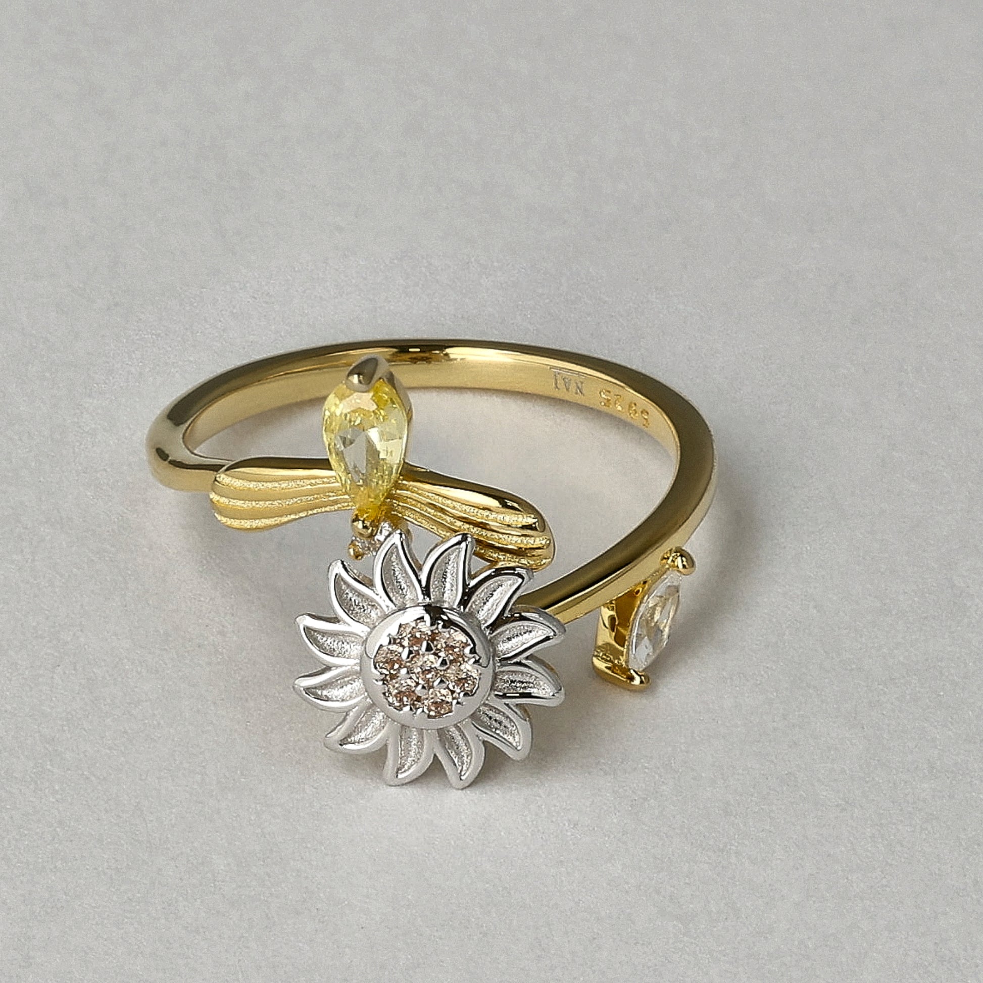 adjustable ring features a golden bee and flower, adorned with high-quality 5A zircon