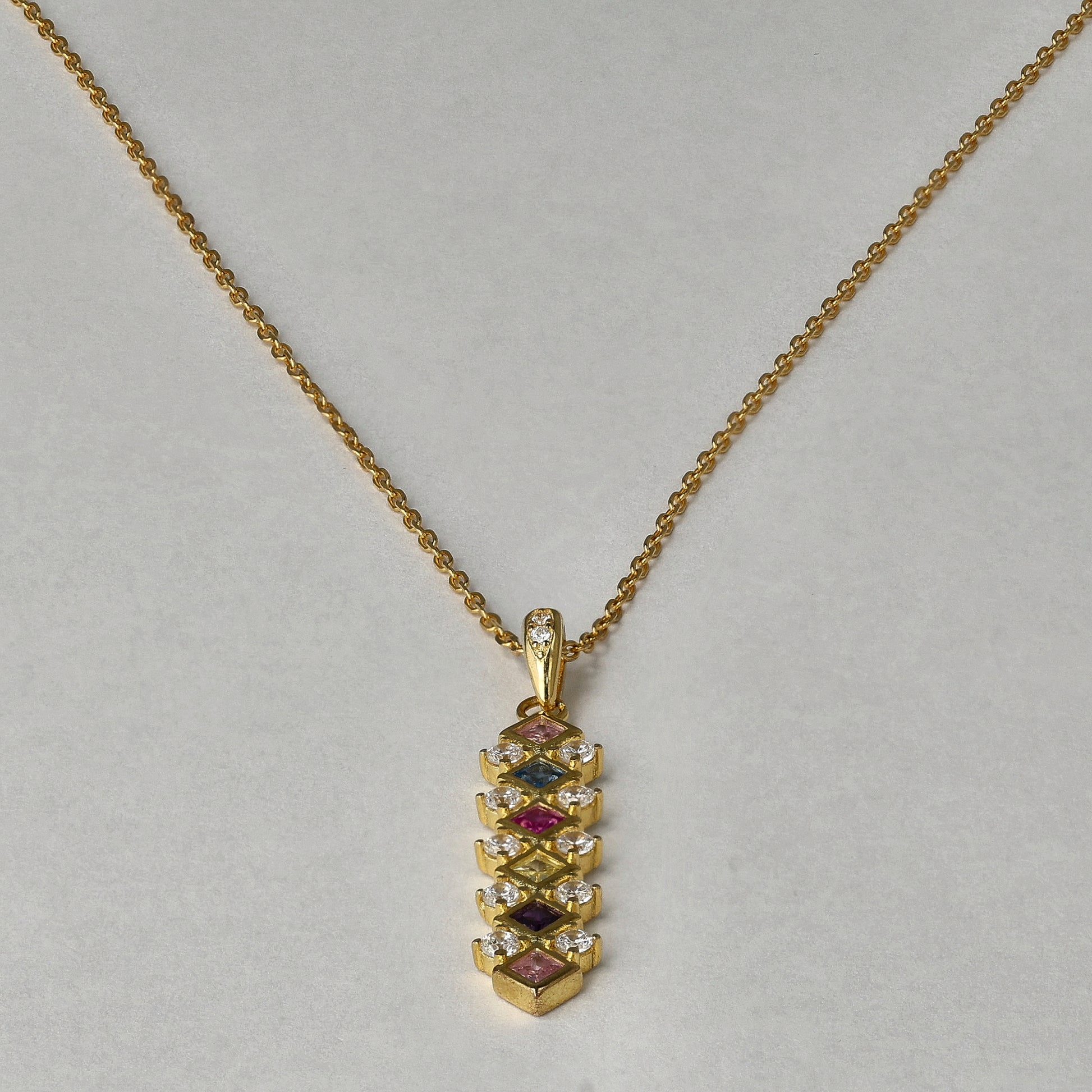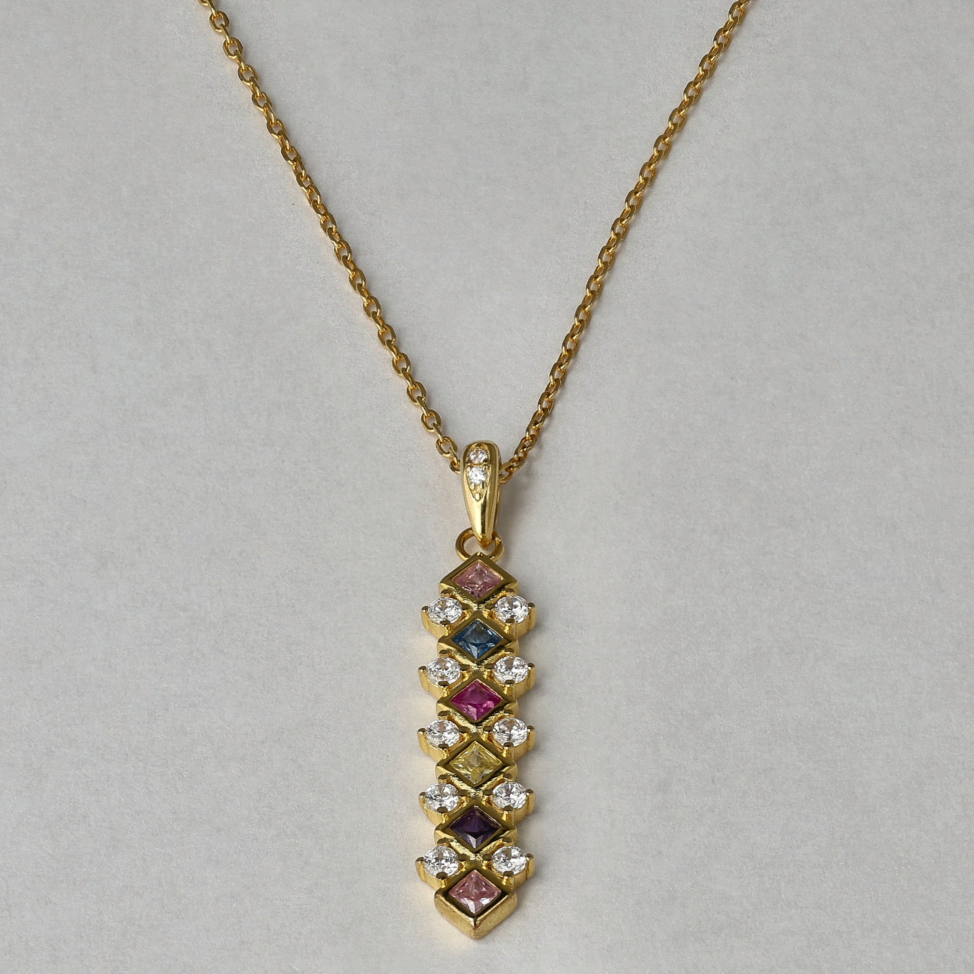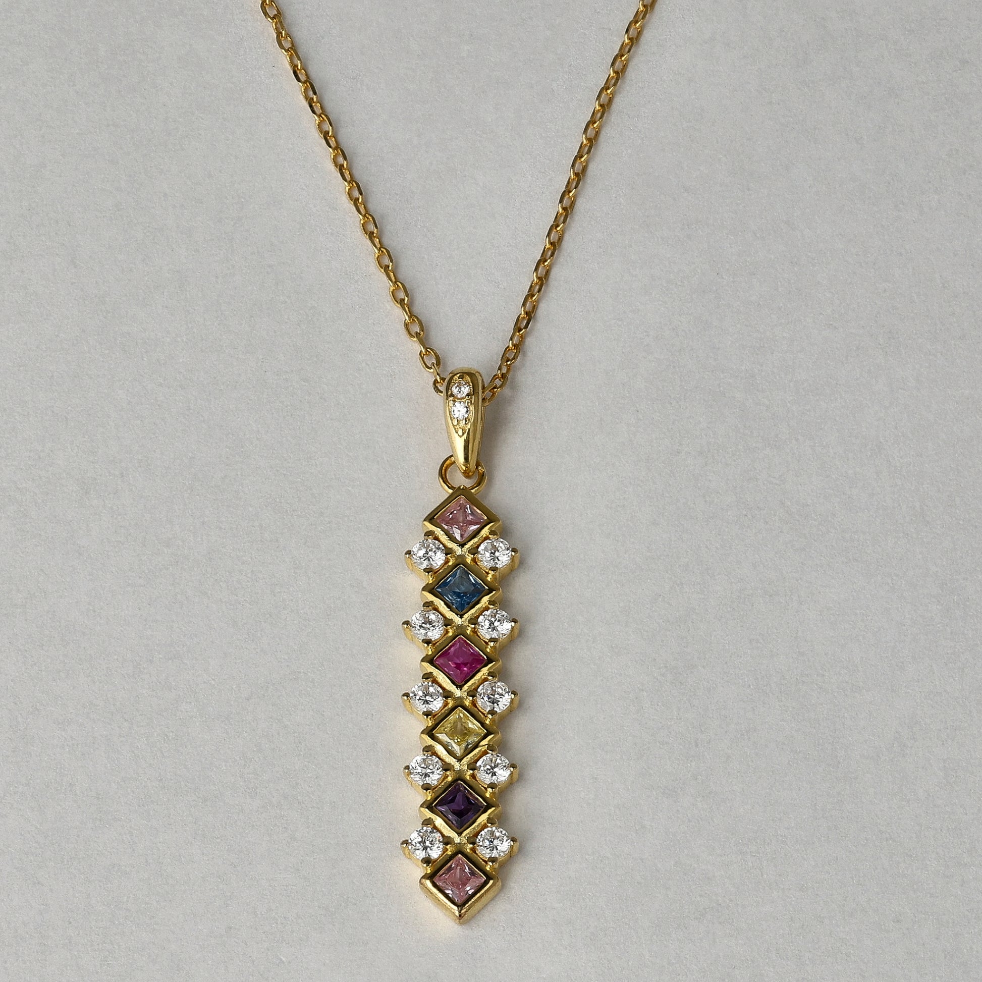 Follow the path where elegance meets the sky. The “Celeste Path” Necklace flows in a vertical line of square-cut 5A zircons, each stone radiating soft pastels and luminous hues. Set in rich 18K gold plating, the design evokes a journey towards light, beauty, and infinite possibilities. An artful statement for those who walk with grace and dream without limits.