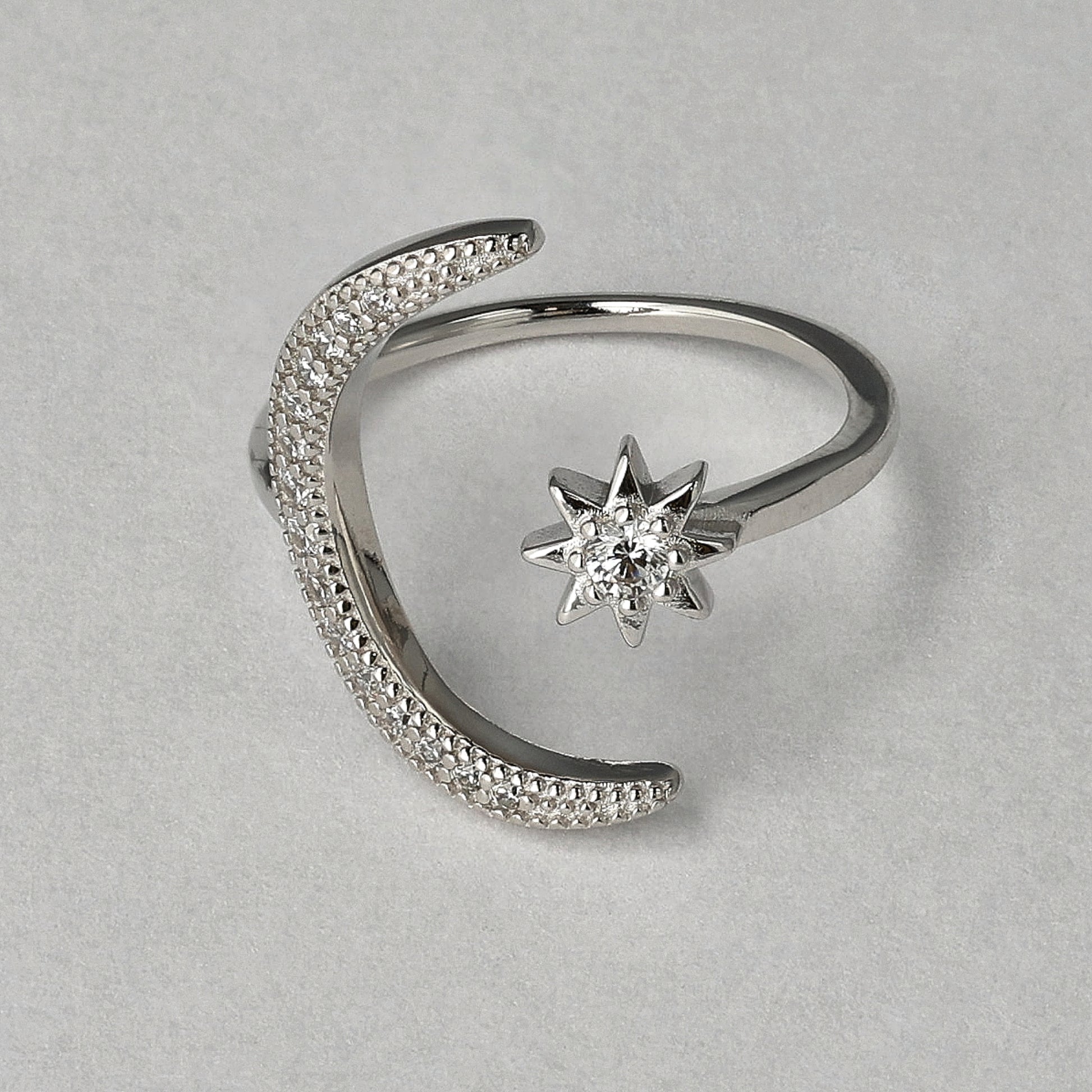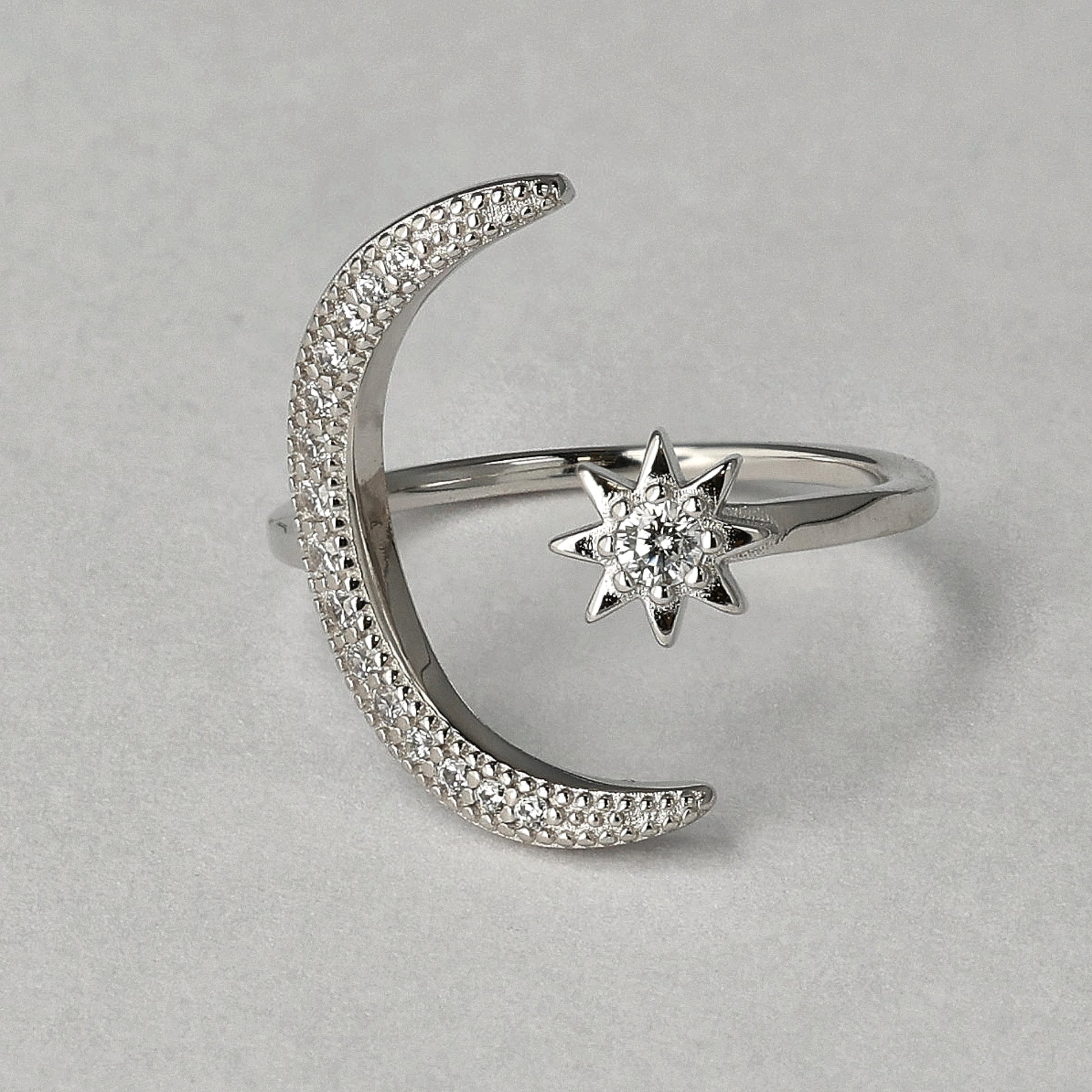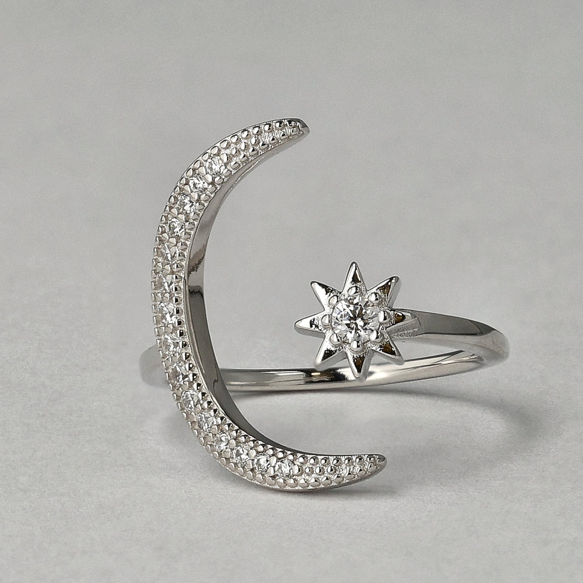 Shine with the mystery of the night sky. The “Celestial Glow” ring features a delicate crescent moon and sparkling star, crafted from 925 sterling silver and set with brilliant 5A-grade zircon stones. A lightweight, adjustable piece made for dreamers who love timeless sparkle and cosmic elegance.