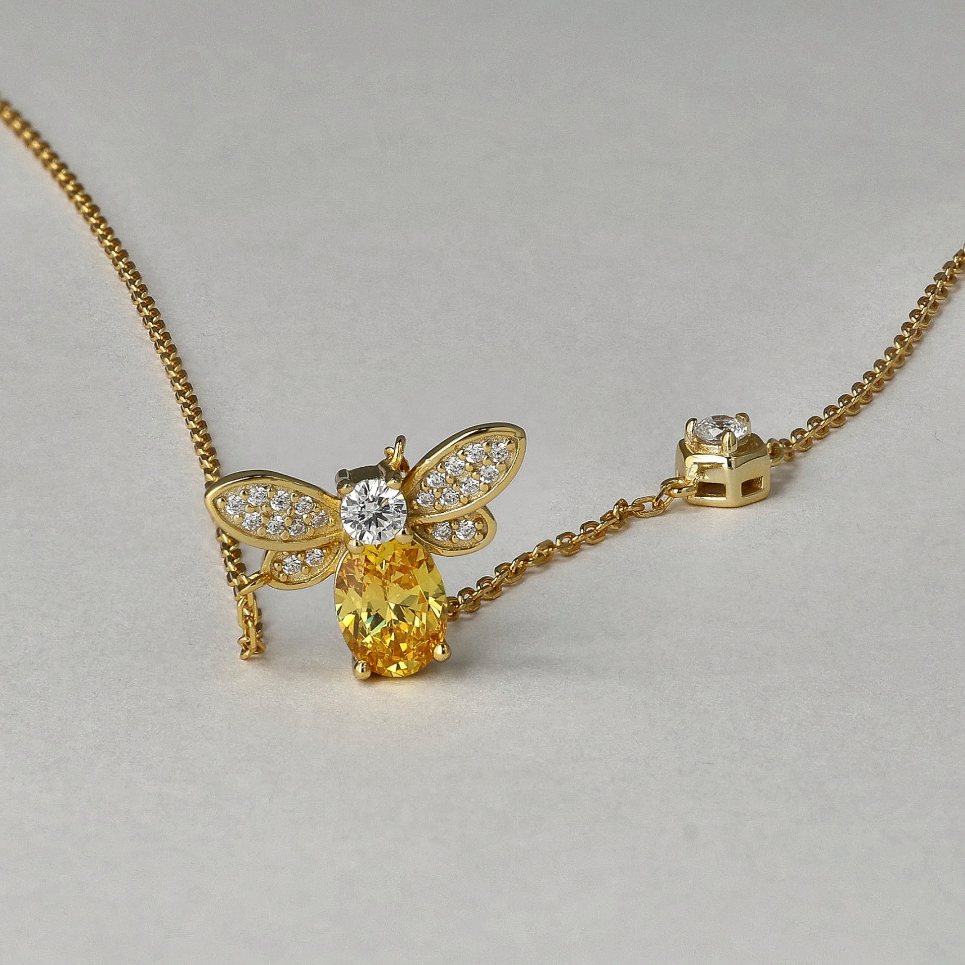A story of light, longing, and endless flight. The “Chasing the Sun” Necklace captures a honeybee mid-journey, its wings glistening with 5A zircons as it reaches toward a single, radiant crystal set apart on the chain. The golden oval-cut stone at its heart glows with the warmth of the sun, while rich 18K gold plating wraps the design in timeless elegance. More than jewelry, it’s a symbol of dreams pursued and light never forgotten.