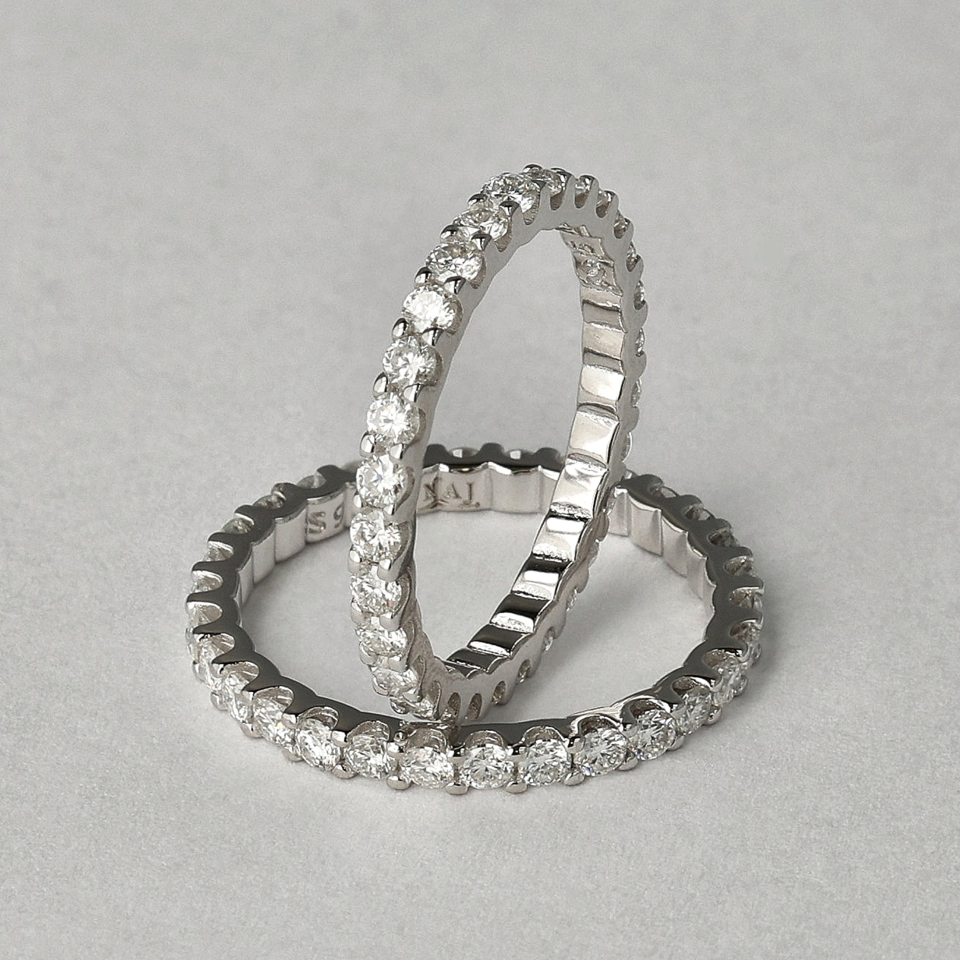 The moissanite stones sit closely together so the light moves smoothly along the band — bright, sharp and noticeable without feeling flashy. It’s a ring that works on its own, stacked, or paired with a statement piece, always adding a defined strip of shine.