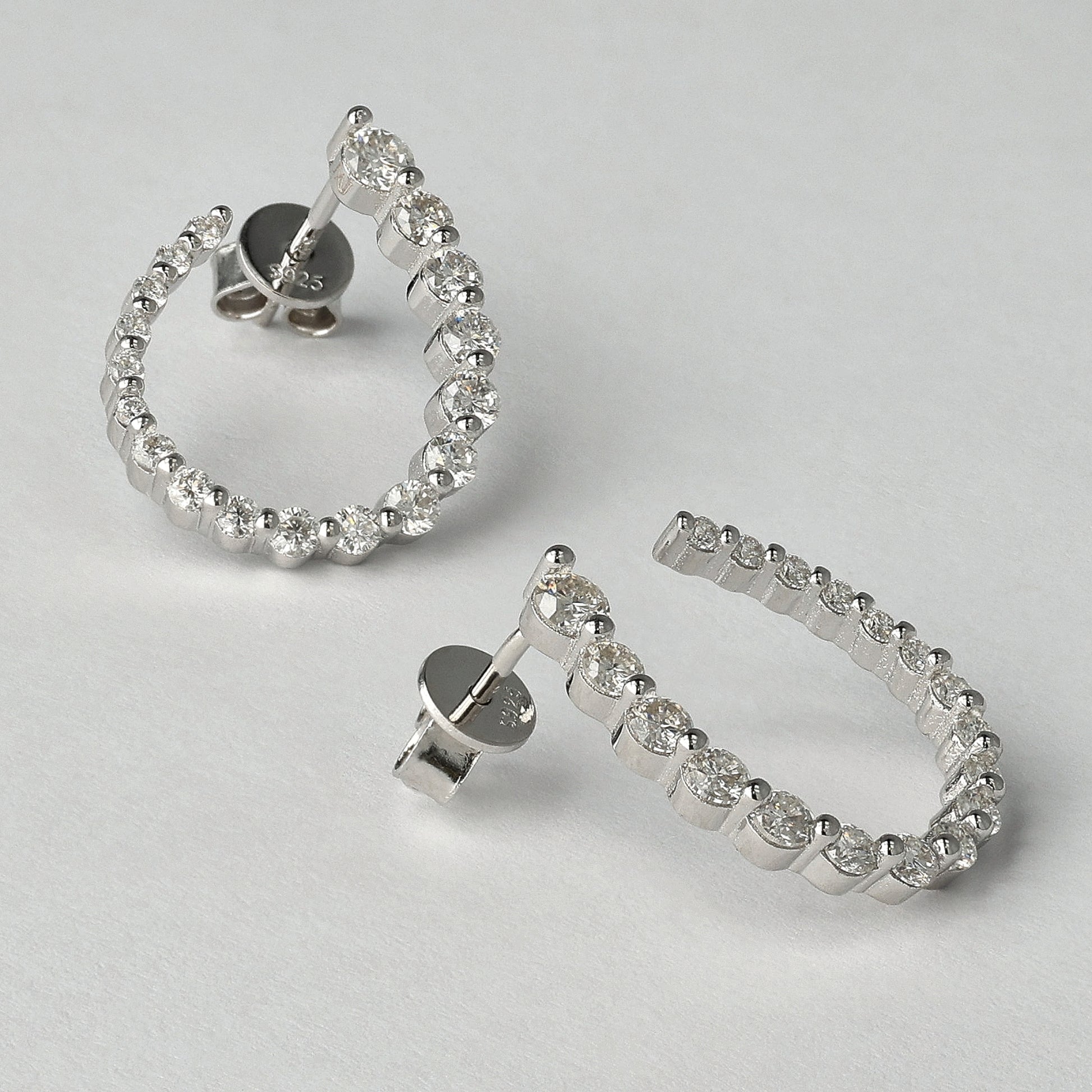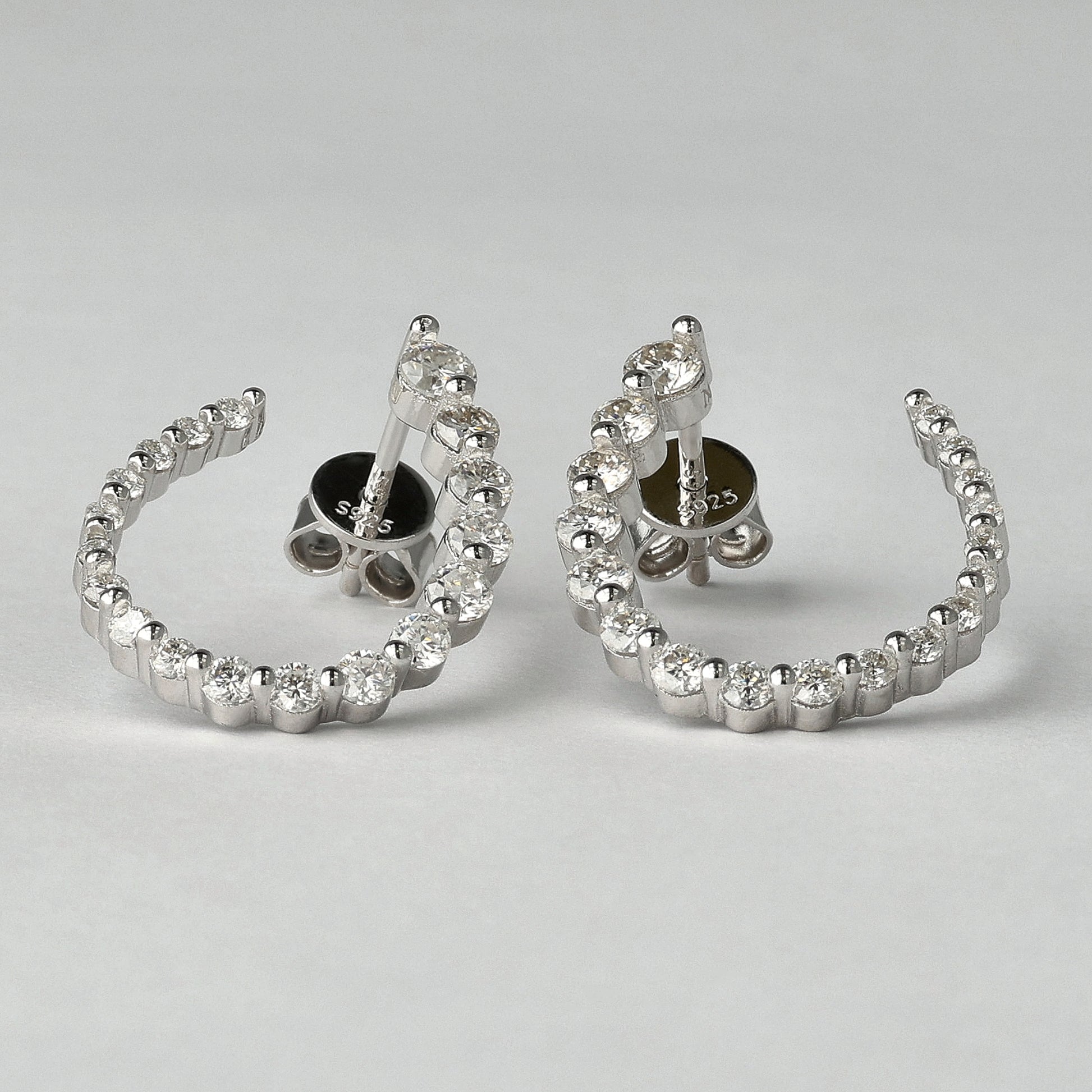 A curve left intentionally open. Open Arc earrings trace the ear with a sequence of round moissanites, forming a sharp half-circle of light. Each stone holds its own presence; together they create a steady, uninterrupted line. Not a full hoop. A pause that makes the shape stronger. Made to follow the natural contour of the ear - precise, architectural, intriguing.