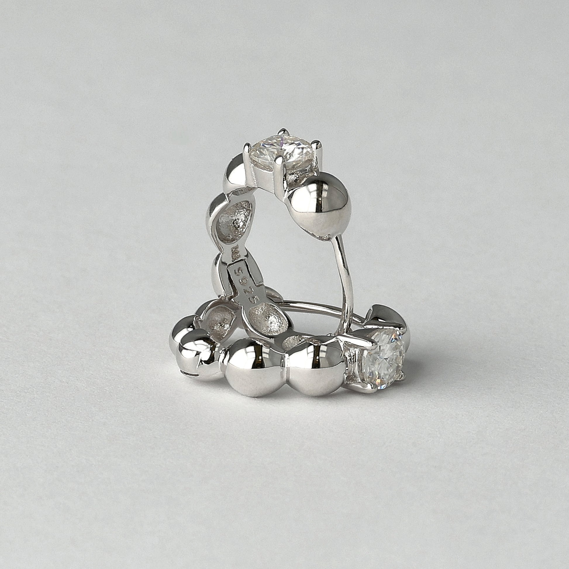 The Bubble hoops pair dimensional silver contours with a 0.6 ct round moissanite at the center - soft volume framed by precise light. Compact at 11 mm inner diameter, they sit close to the ear while maintaining presence. Modern. Controlled. Defined.
